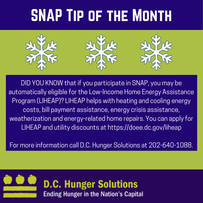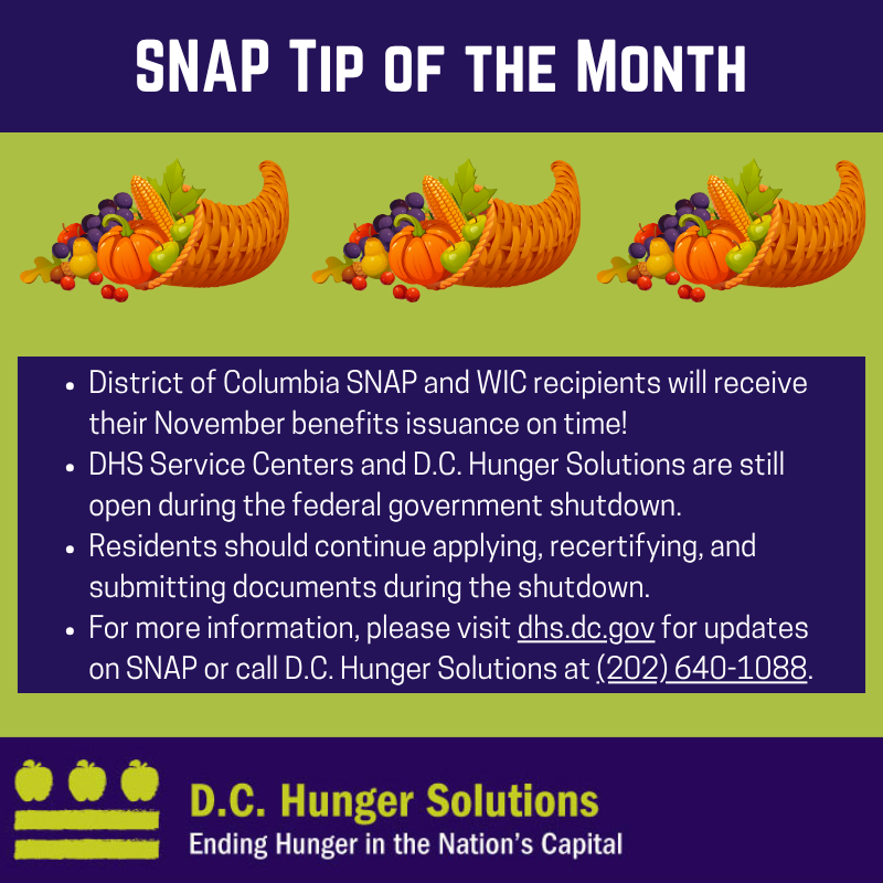 We want to reassure D.C. residents that SNAP (Supplemental Nutrition Assistance Program) and WIC (Women, Infants, and Children) benefits are still available at this time.